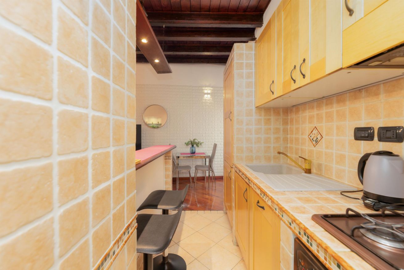 La zona giorno si apre con un piccolo open space che integra cucina, divano letto e TV a schermo piatto, perfetto per rilassarsi. La cucina, seppur compatta, è completa di forno, frigorifero, fornelli, bollitore e di tutto l’essenziale per preparare i pasti. La camera da letto matrimoniale, luminosa e ben organizzata, garantisce tranquillità e comodità. Il bagno dispone di WC, bidet e vasca con doccia, una soluzione pratica e versatile.