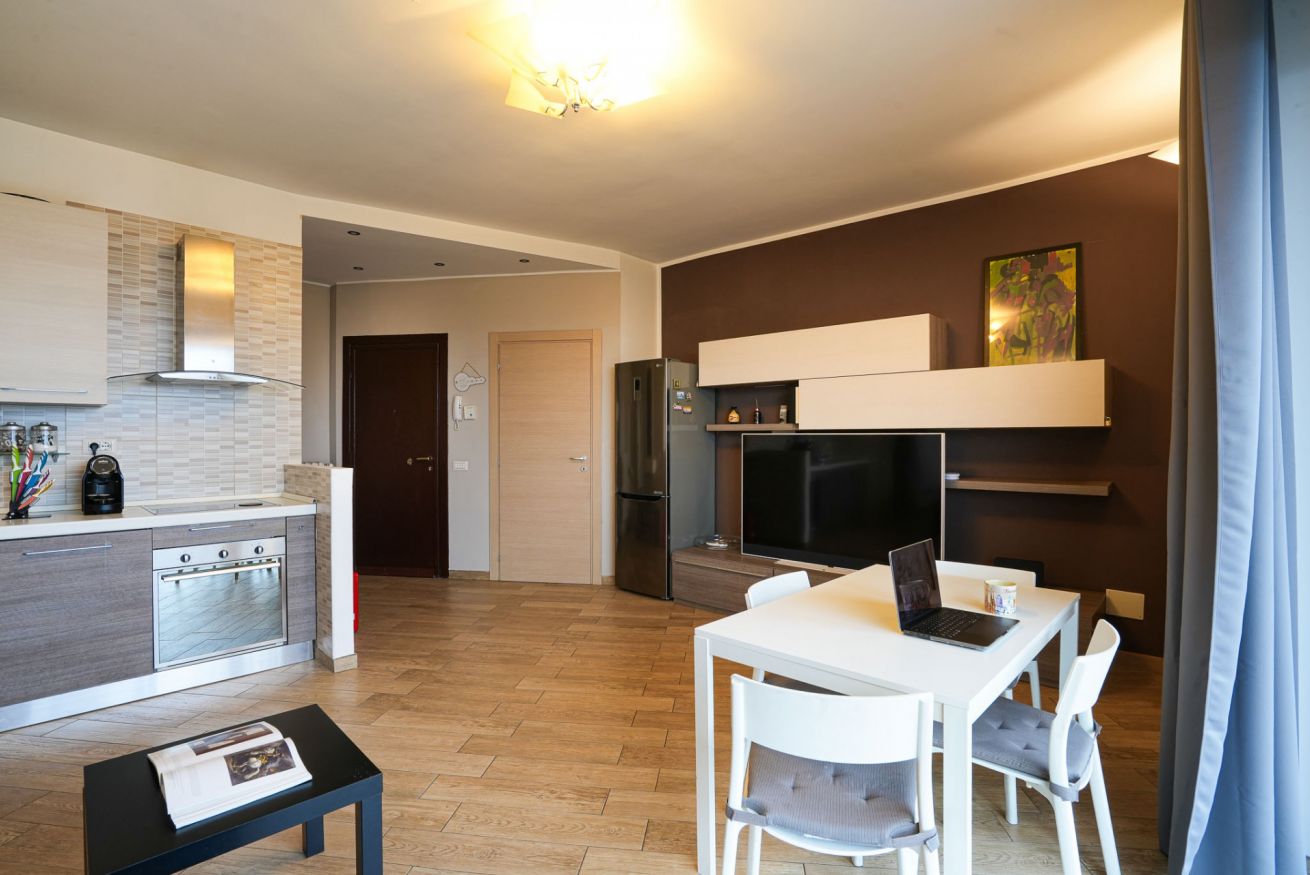 • Un soggiorno con cucina a vista, completamente attrezzata, e un divano letto molto comodo per ospitare fino a 4 persone in totale