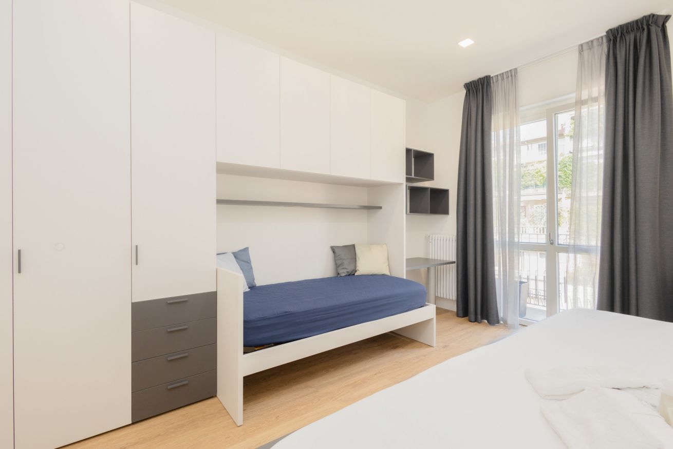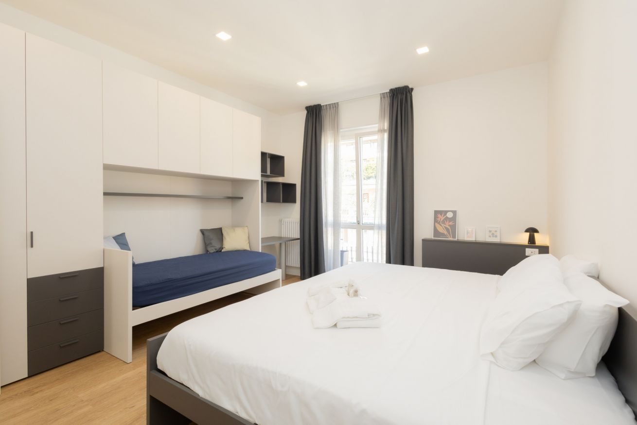 La camera da letto è composta da un grande letto matrimoniale king size 240cm x 190cm e un letto singolo, con armadi capienti.