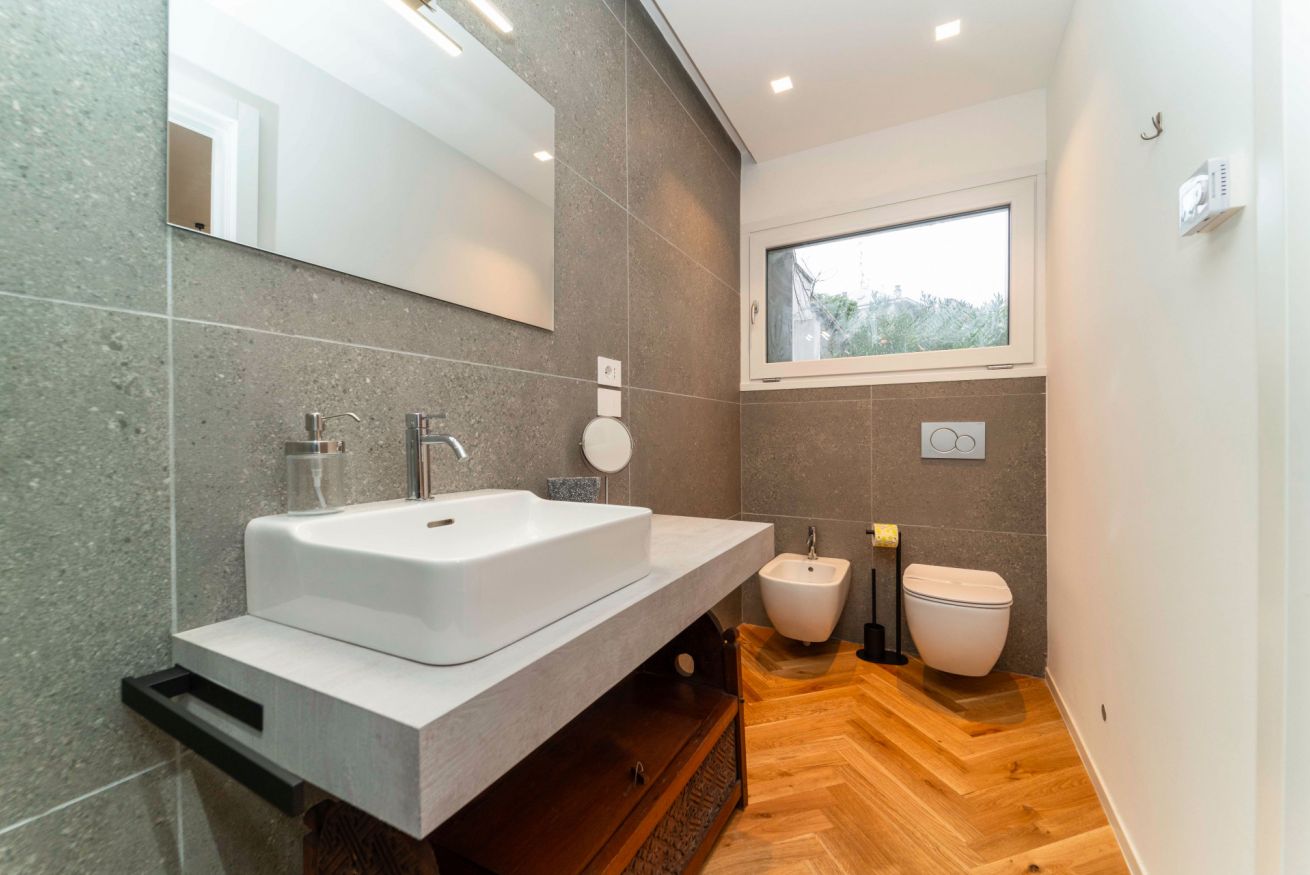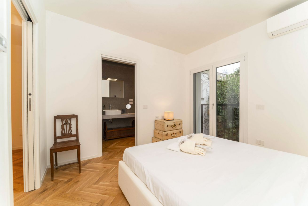 Al piano superiore si trova la spaziosa camera da letto dotata di un ampio guardaroba, l’ideale per riporre ordinatamente valigie e abiti. Il bagno en suite è completo di doccia, wc e bidet, garantendo massima privacy e comfort.