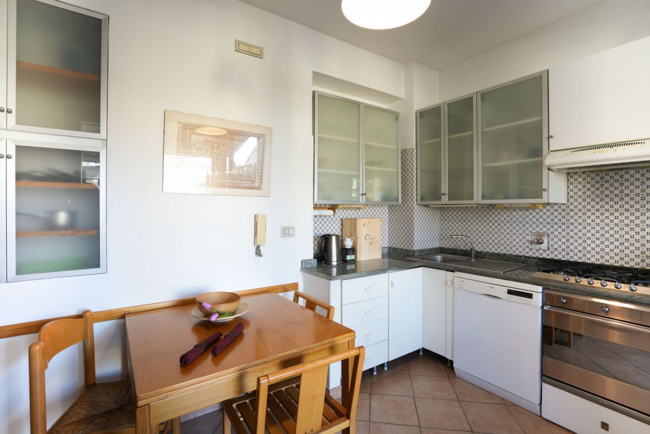 La cucina abitabile, completamente attrezzata con elettrodomestici moderni (frigorifero, forno, piano cottura, lavastoviglie), è ideale sia per una colazione veloce che per una cena completa. Ogni elemento è pensato per offrire funzionalità e praticità.