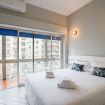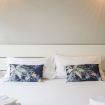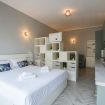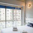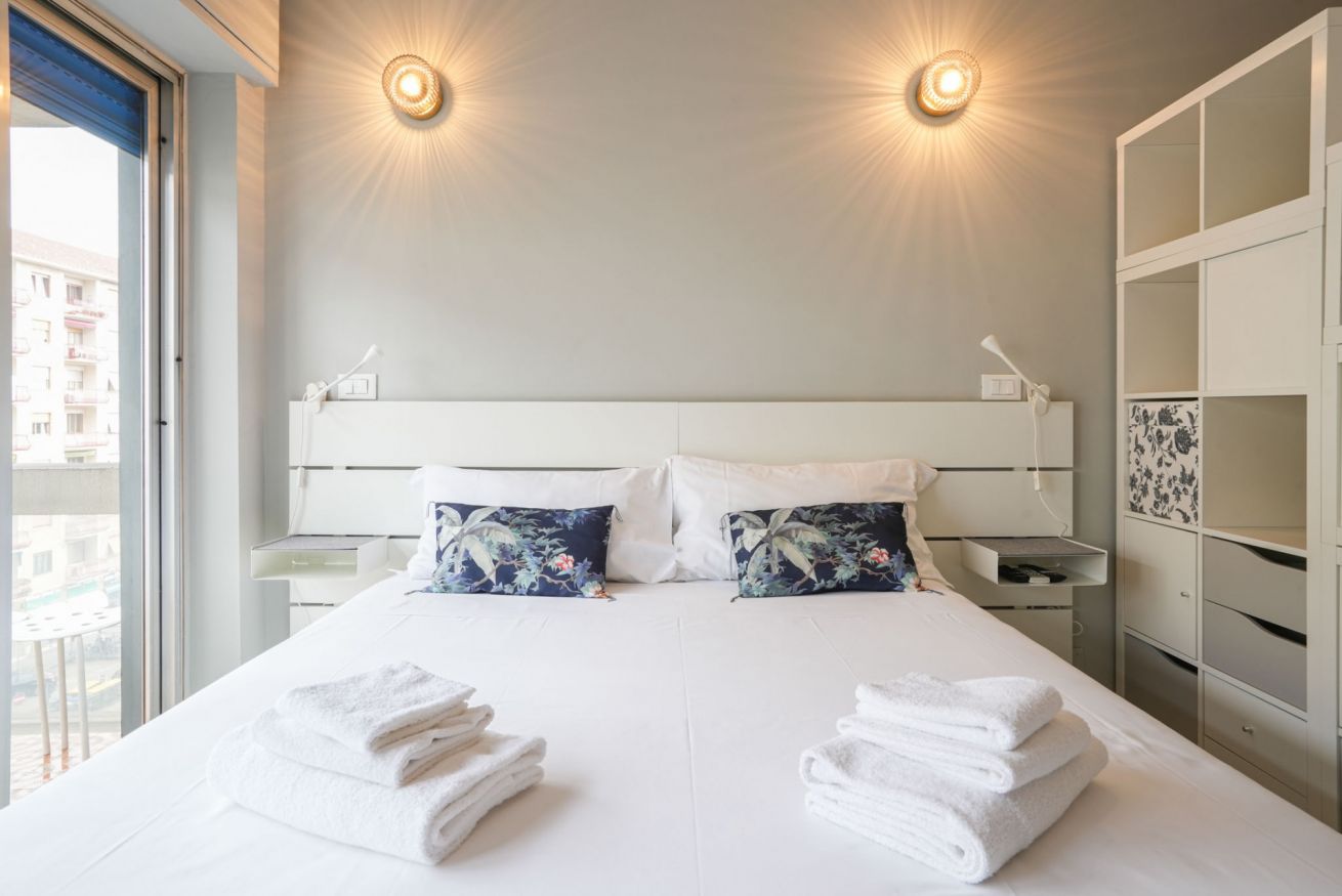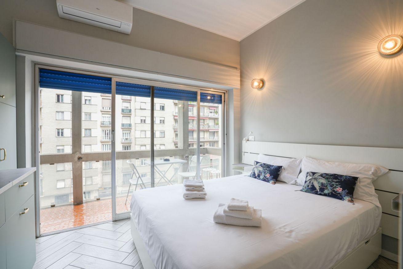 La zona notte è composta da un letto matrimoniale con una grande vetrata che si affaccia sul panorama urbano di Torino.