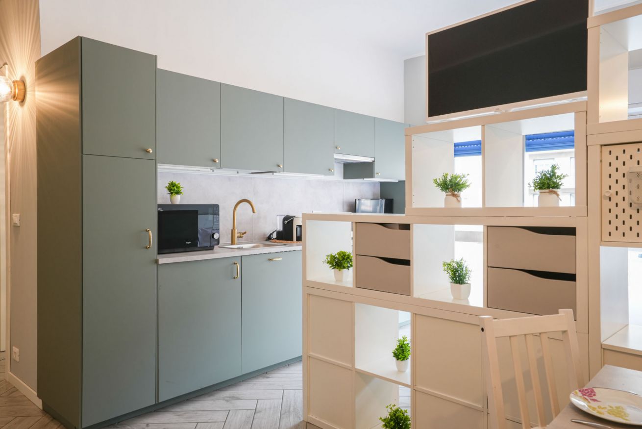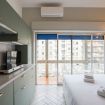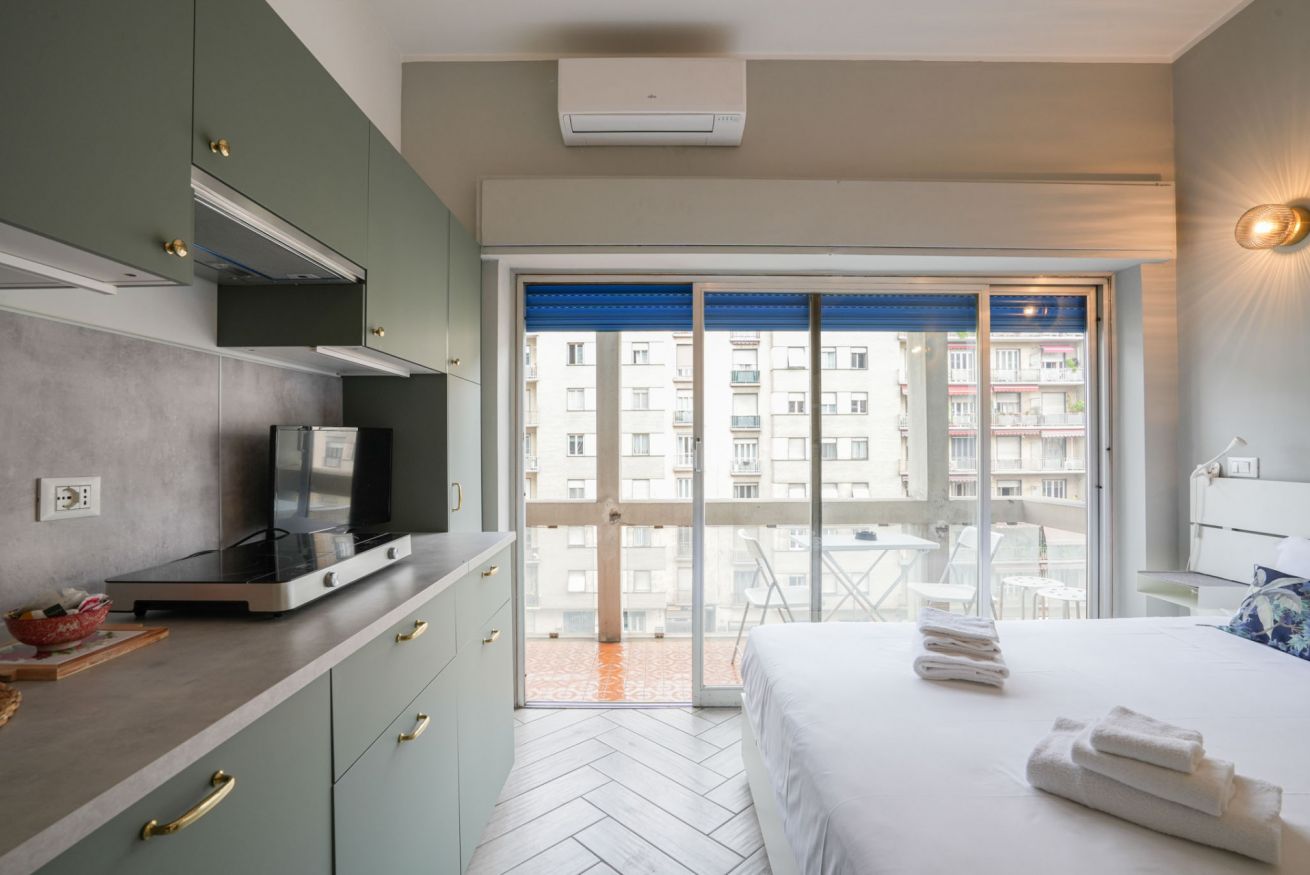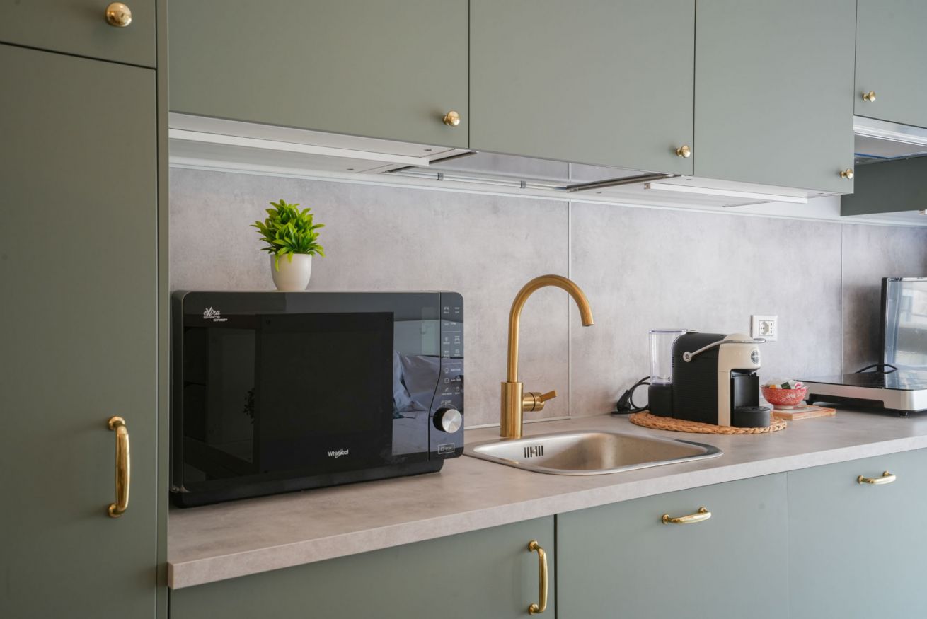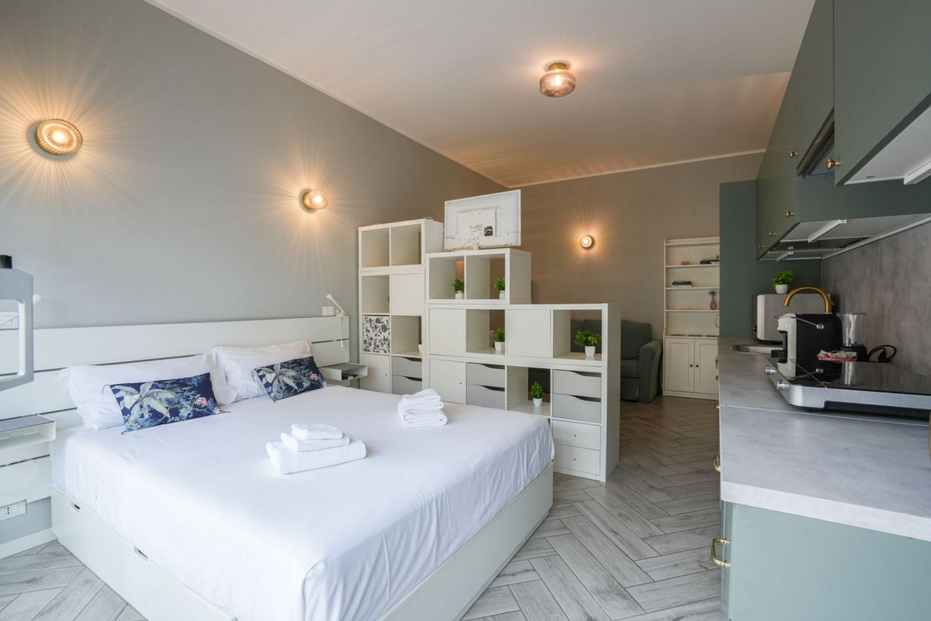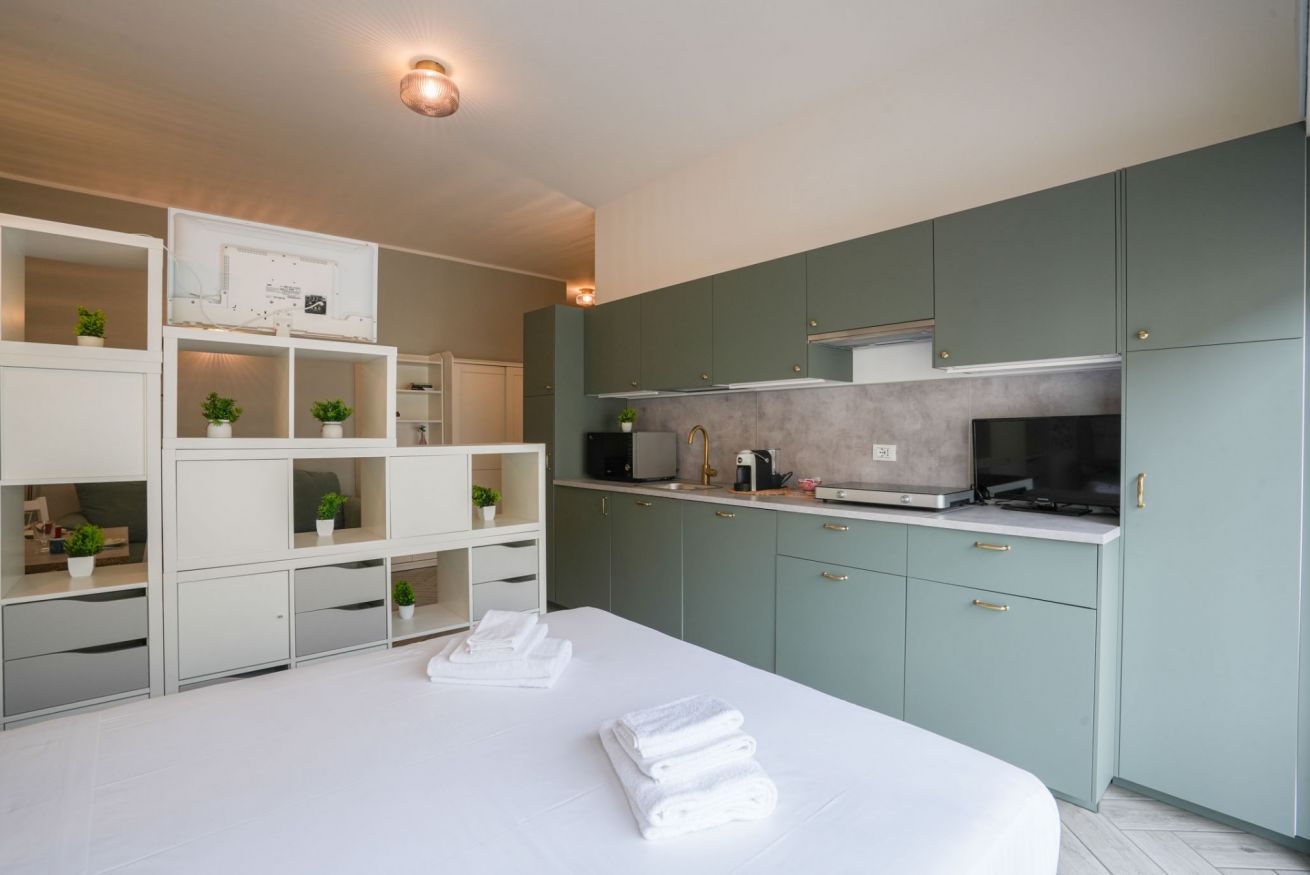 La cucina, integrata nello stesso spazio, è completa di elettrodomestici e utensili per cucinare, offrendo tutto il necessario per preparare colazioni veloci o pasti più elaborati.