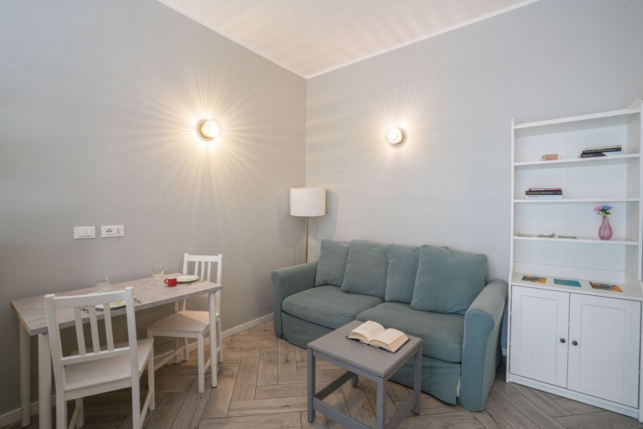 L’ambiente principale è organizzato in modo pratico e funzionale: un divano che si trasforma facilmente in un letto, un armadio e libreria per i vostri effetti personali, una TV a schermo piatto per i momenti di relax.