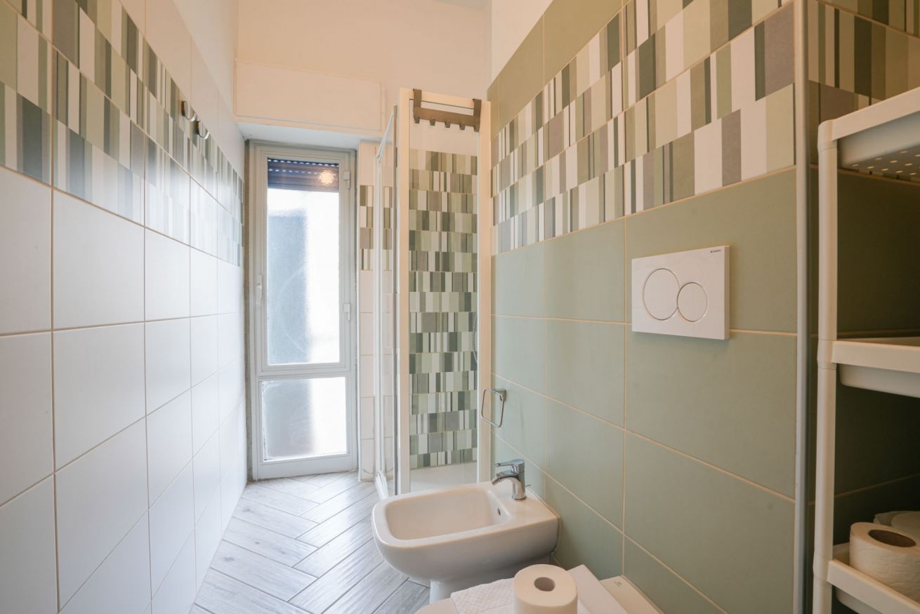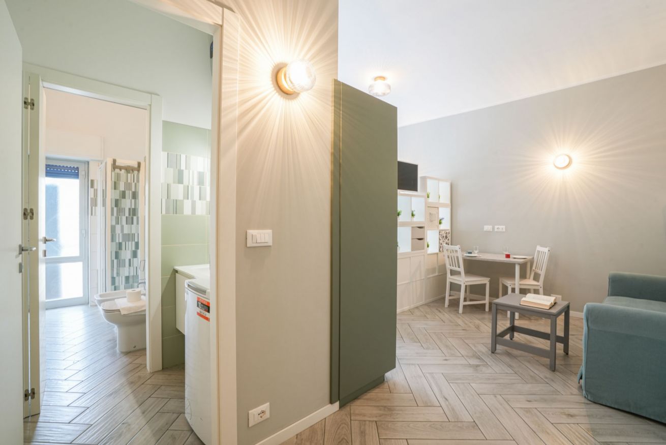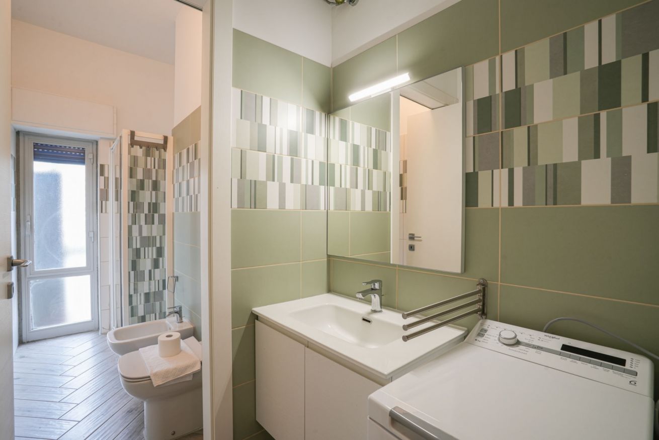 Il bagno, moderno e ben organizzato, dispone di doccia, WC e bidet, lavatrice, garantendo la massima comodità durante il soggiorno.