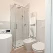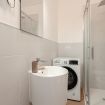 Il bagno è equipaggiato con una doccia, wc, bidet e una lavatrice, fornendo tutto il necessario per un soggiorno confortevole.