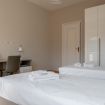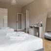 The apartment features three bedrooms, all furnished with joinable single beds, making them ideal for comfortably hosting friends, colleagues, or families. Each room is bright, decorated in a modern style, and equipped with large wardrobes and desks—perfect for business or study stays.