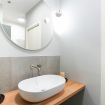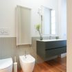 I bagni moderni si distinguono per rivestimenti effetto pietra e tonalità naturali che richiamano la calma dei paesaggi collinari.