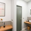 Ogni dettaglio è stato scelto con cura: superfici in marmo, legno e vetro dialogano con una palette cromatica che unisce bianco puro, sfumature di grigio e verde salvia in un equilibrio perfetto.
