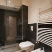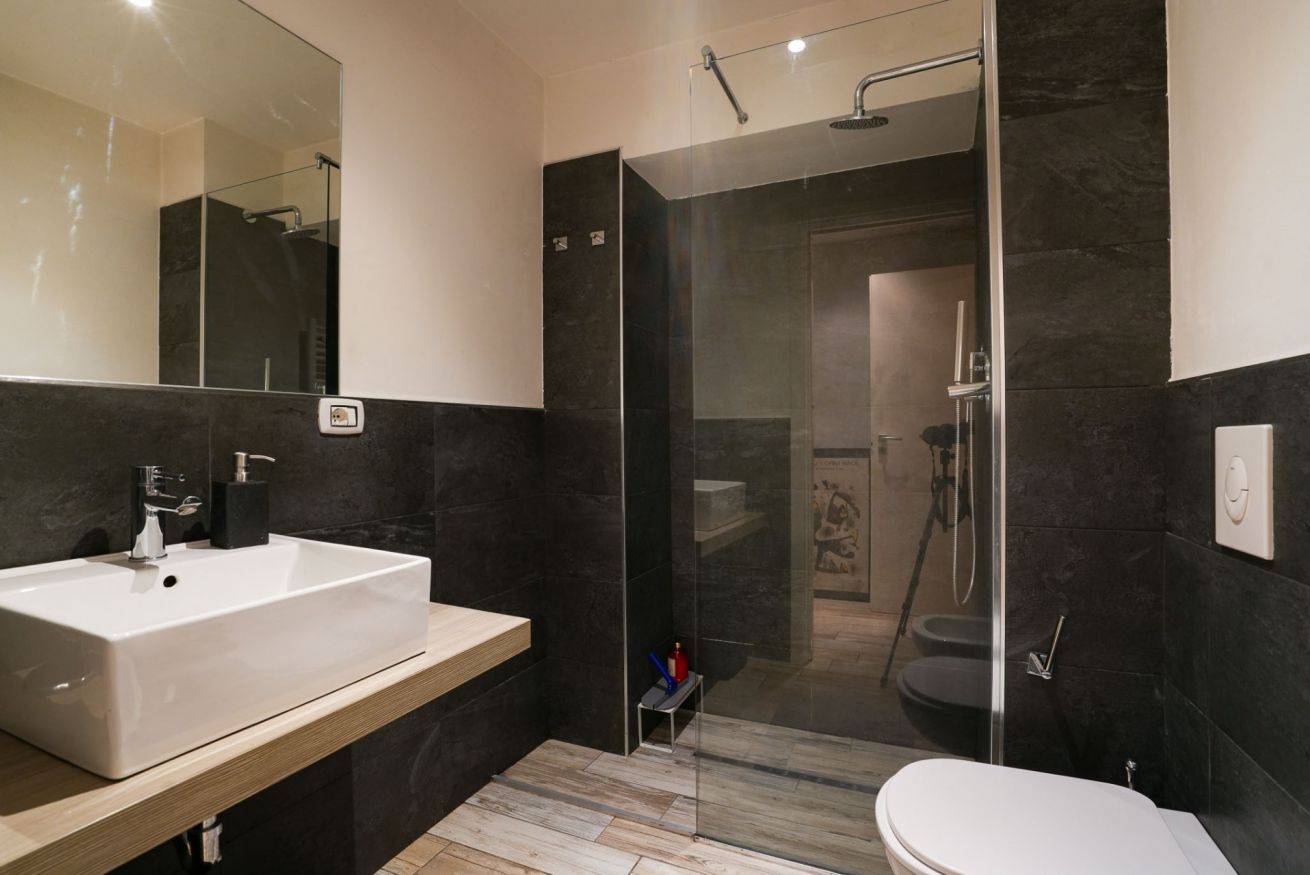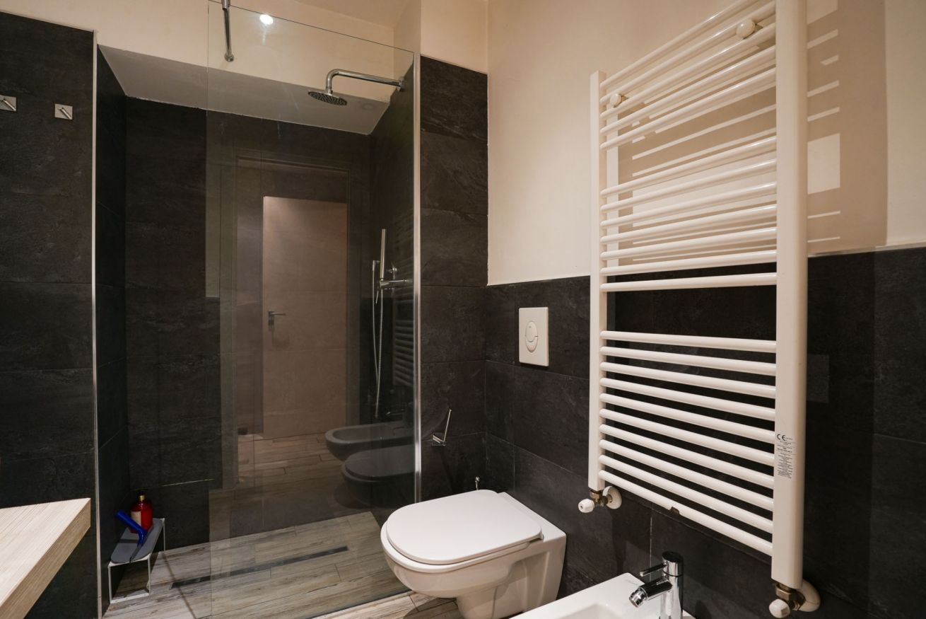 Il bagno, moderno e ben organizzato, è dotato di doccia spaziosa, bidet, asciugacapelli e accessori essenziali per il soggiorno.