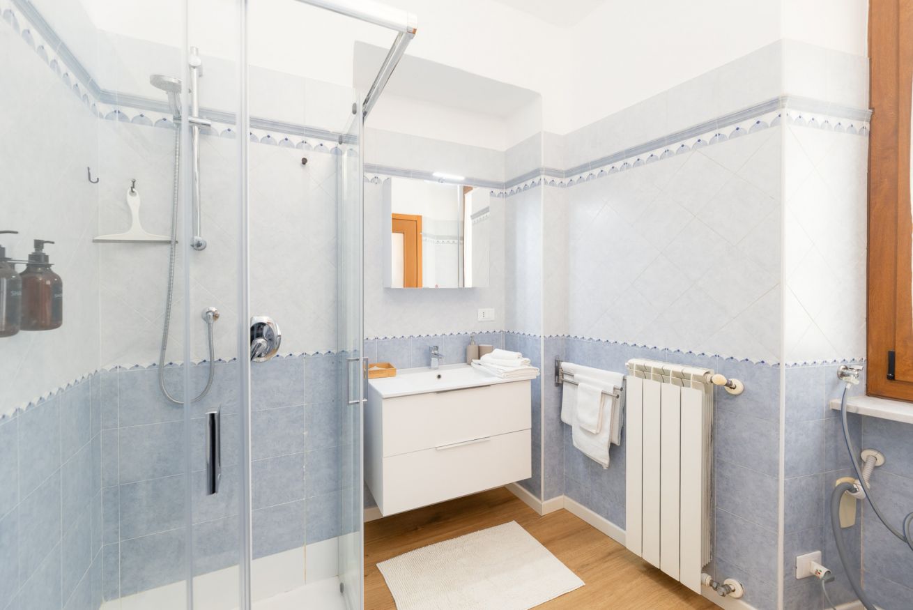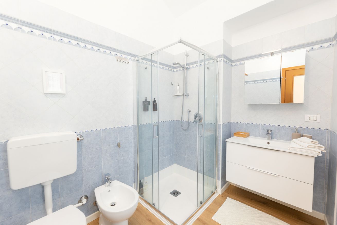Il bagno è moderno e funzionale, con lavabo, WC, bidet e doccia. Troverai asciugamani freschi e un welcome kit con bagnoschiuma & shampoo.