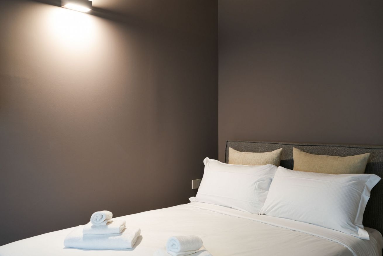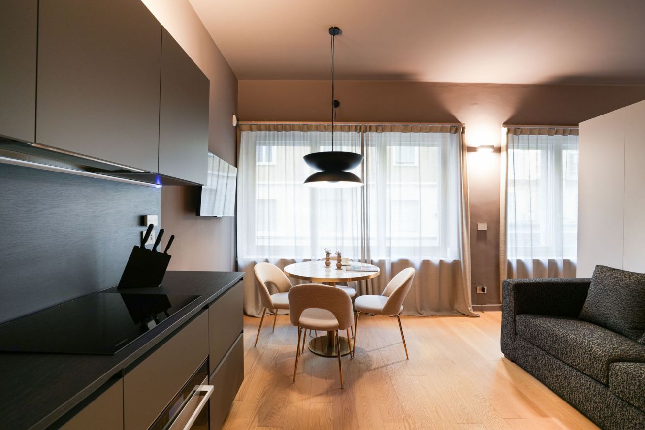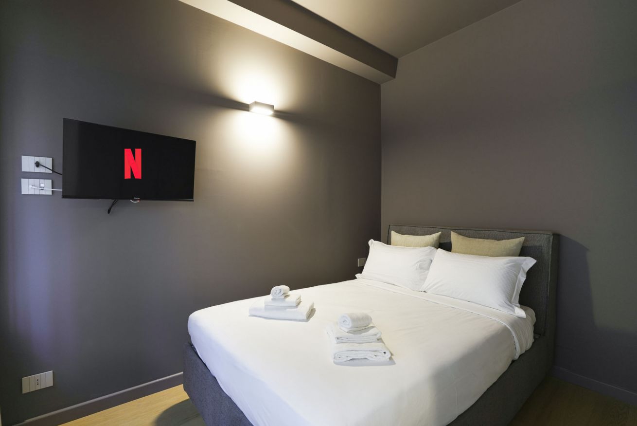 L’appartamento è composto da un ampio open space con divano letto, una cucina completa di lavastoviglie, forno, forno a microonde, bollitore e macchina del caffè . Il bagno moderno e luminoso dispone di una doccia ampia e di bidet, mentre la zona notte accoglie un letto matrimoniale confortevole e un armadio spazioso. Completano l’ambiente una TV a schermo piatto e ampie vetrate che donano luce naturale e una bella vista sulla città.