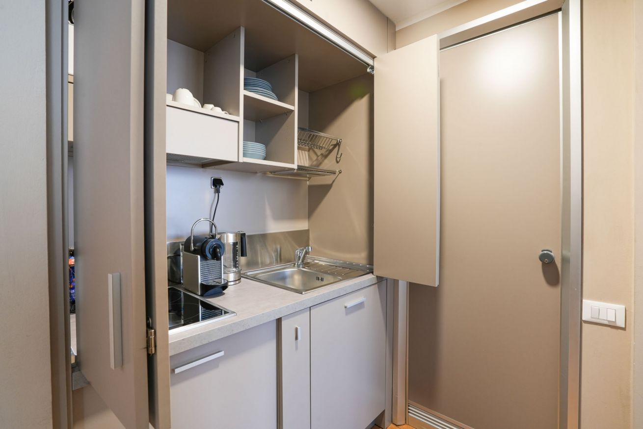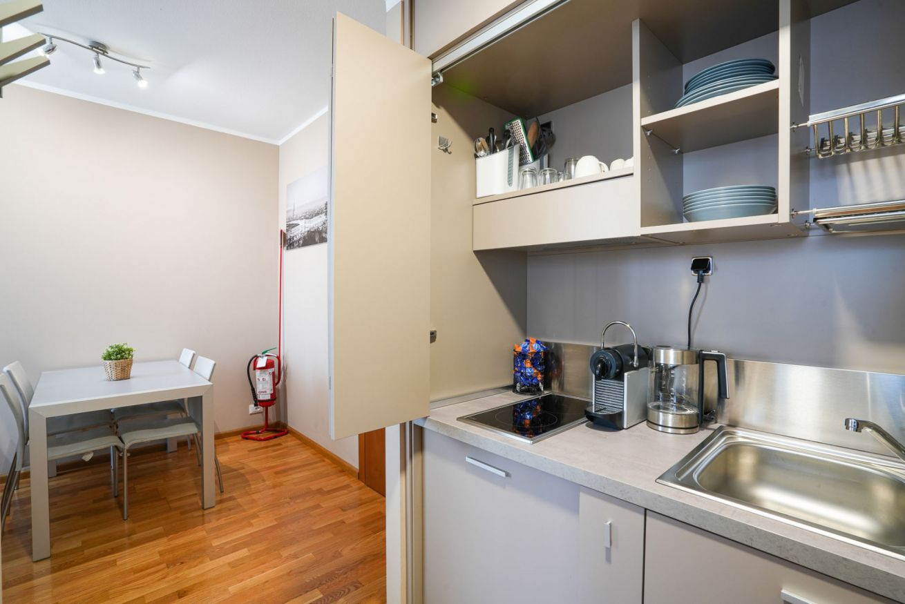 La cucina, luminosa e ben accessoriata, ti consente di preparare i tuoi piatti preferiti in un ambiente funzionale e accogliente: frigorifero, freezer, fornelli, pentole e stoviglie completi; manca il forno ma lo spazio è sfruttato al meglio. Il tavolo da pranzo invita a momenti di condivisione e convivialità.