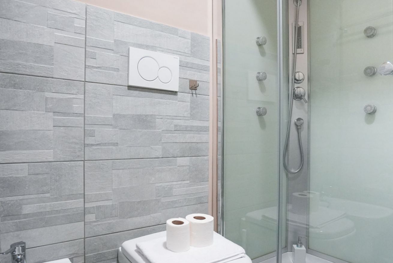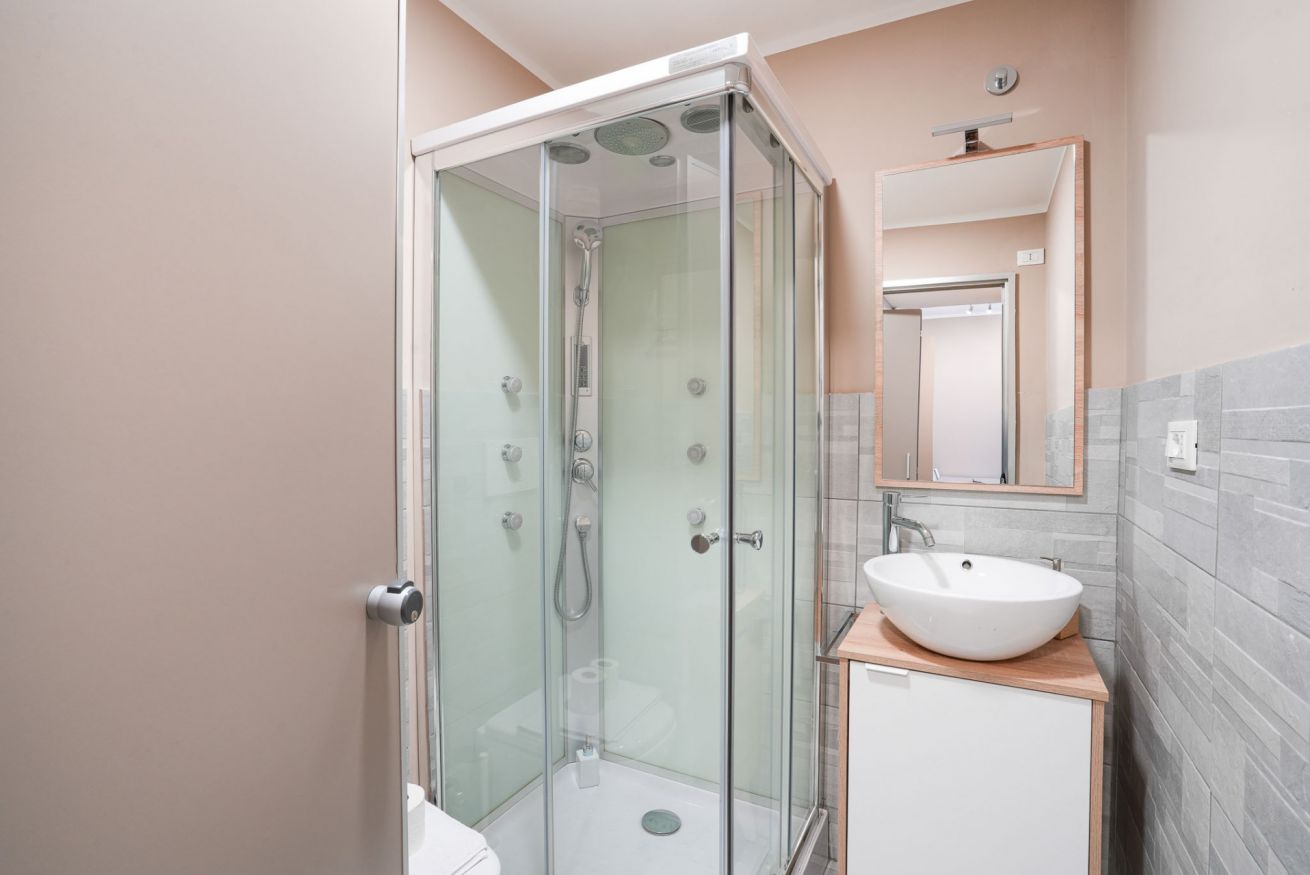 Il bagno, curato nei dettagli, è dotato di una doccia ampia e moderna, ideale per rigenerarsi dopo una passeggiata tra le bellezze torinesi.
