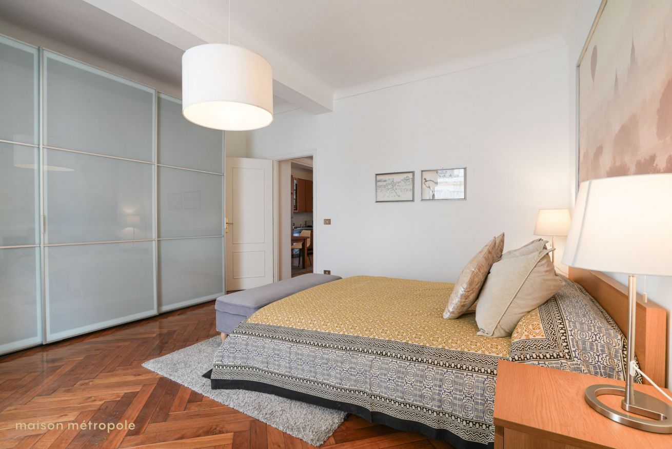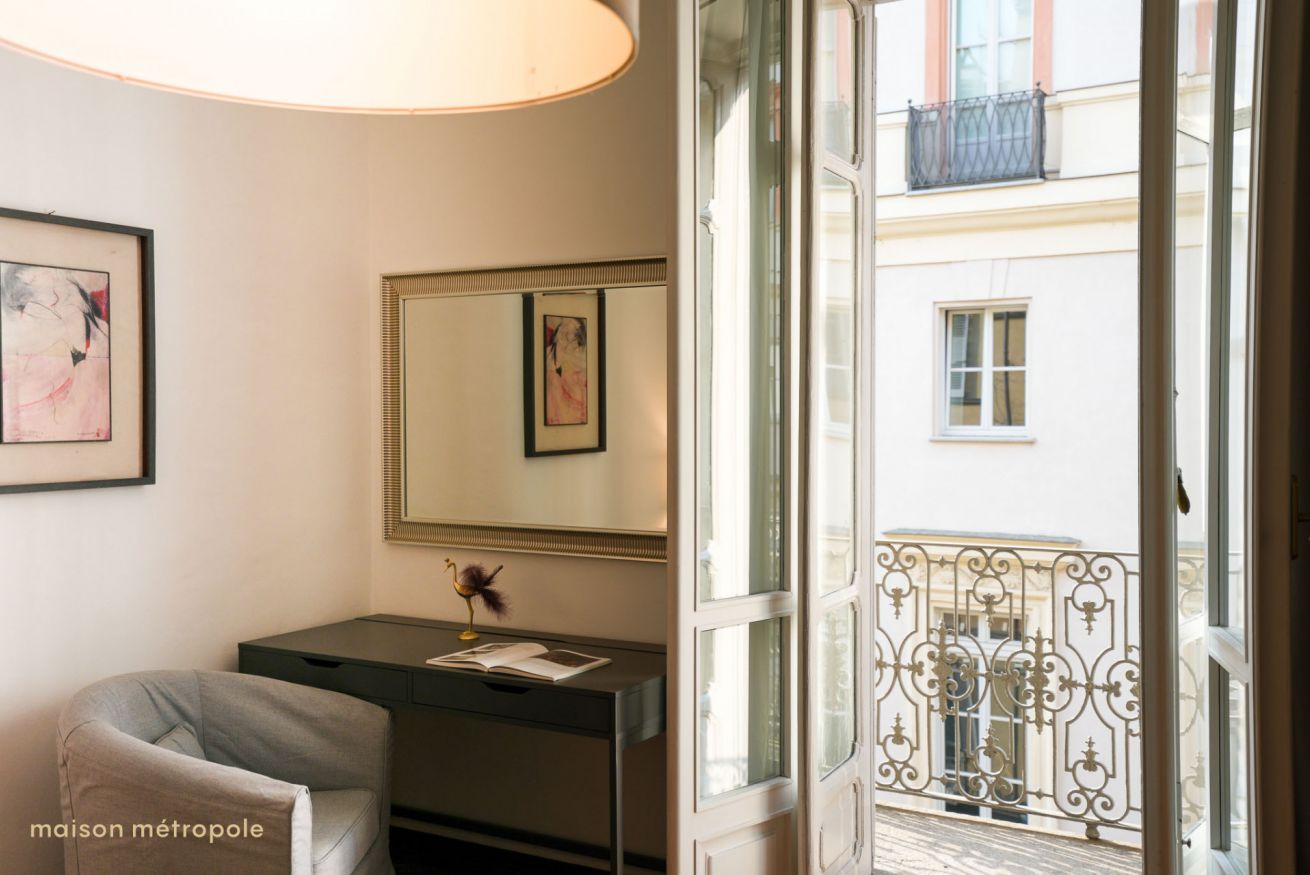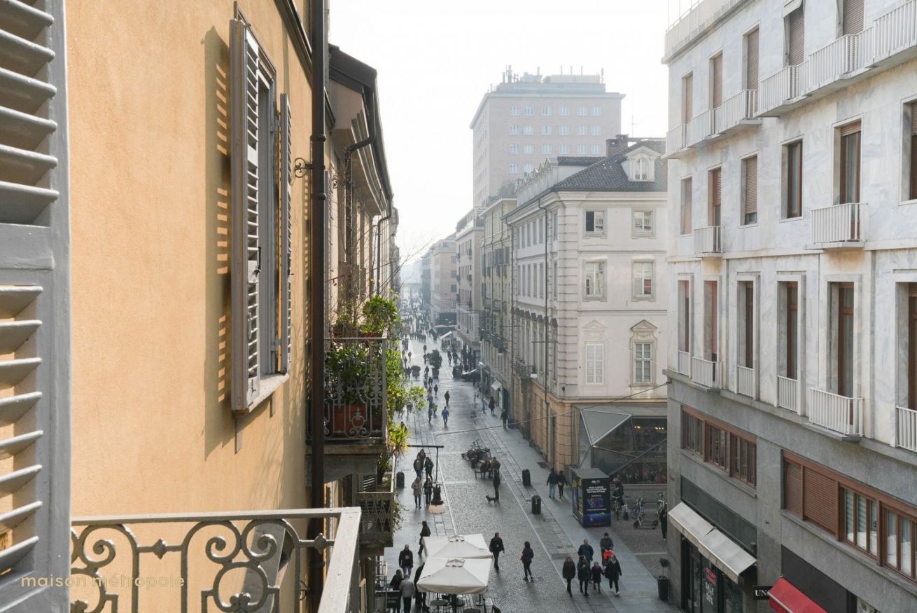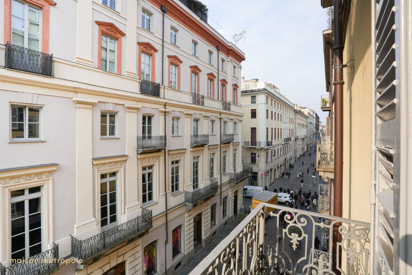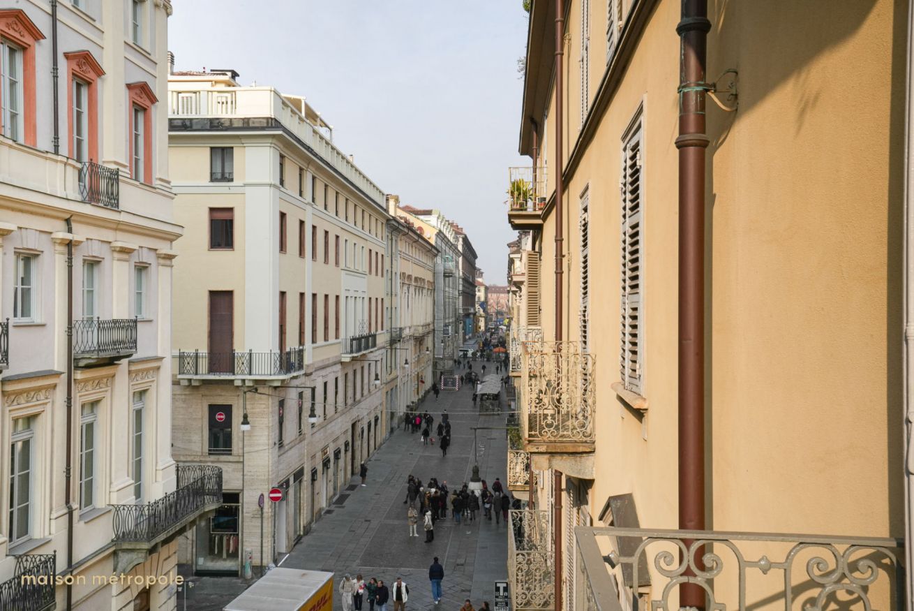 La camera da letto si affaccia direttamente su Via Lagrange, la via pedonale più bella di Torino, regalando una vista affascinante e un’atmosfera tipicamente torinese.