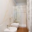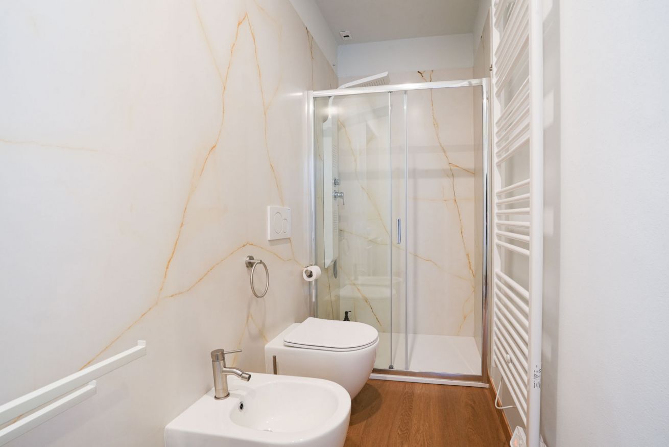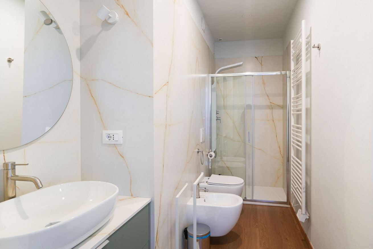 Il bagno è moderno e funzionale, con lavabo, WC, bidet e doccia. Troverai asciugamani freschi e un welcome kit con bagnoschiuma e shampoo.