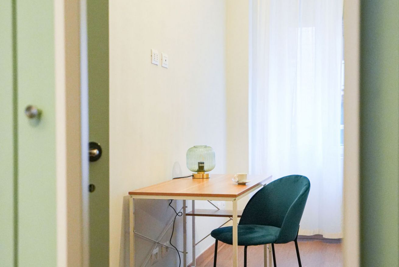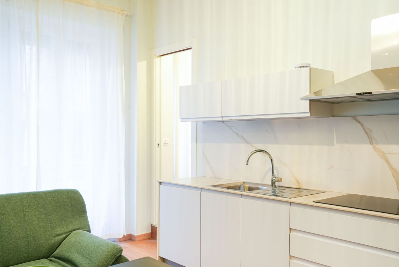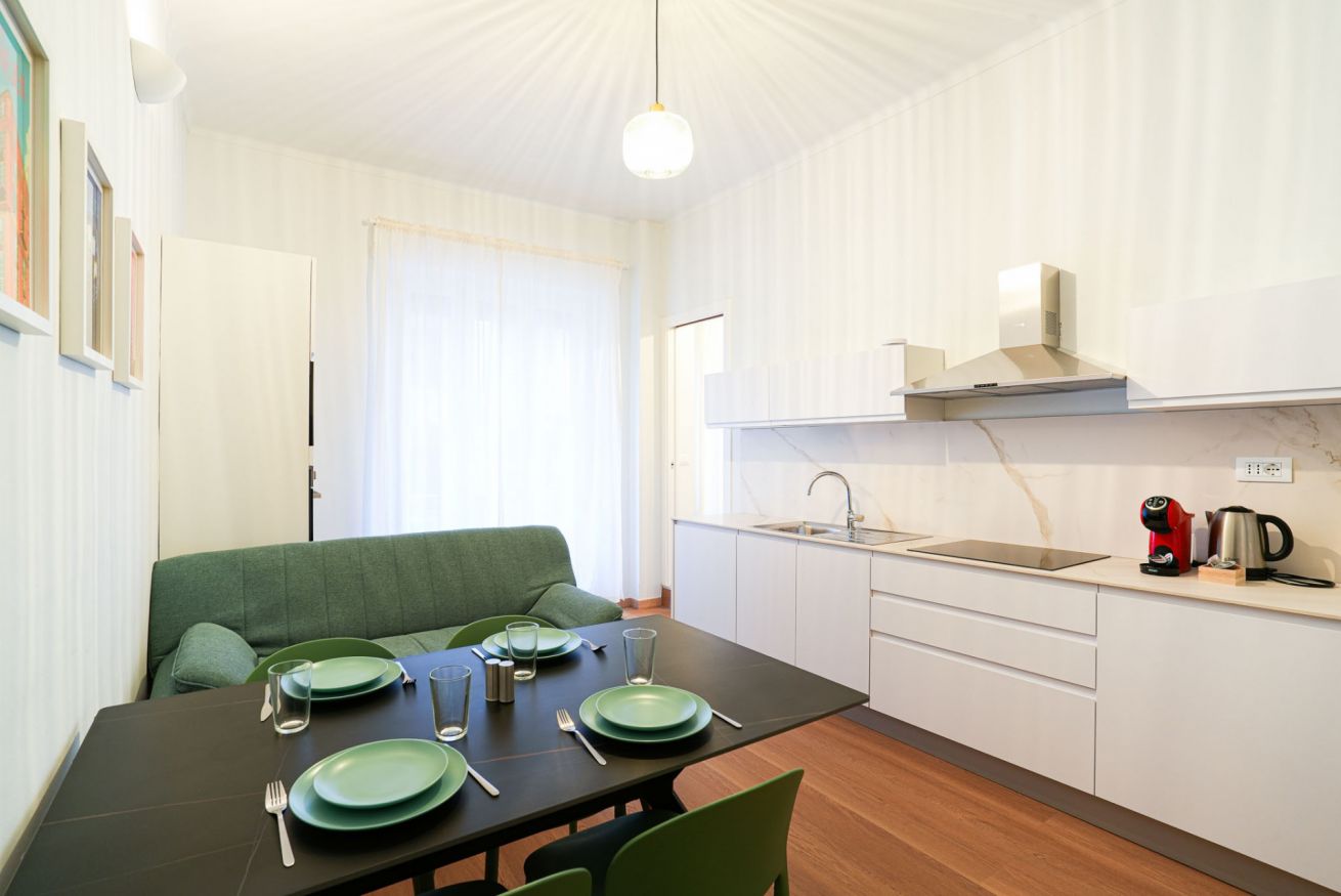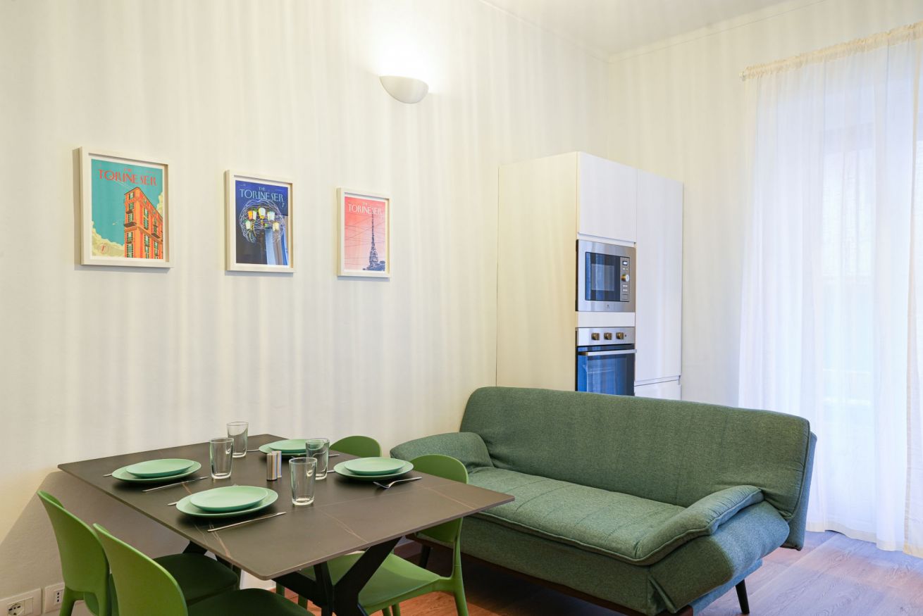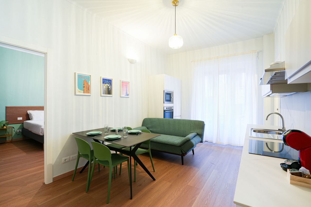 Ti accoglierà la zona giorno, composta da un comodo divano, cucina e tavolo da pranzo, un'atmosfera perfetta per rilassarti dopo una giornata in giro per la città.